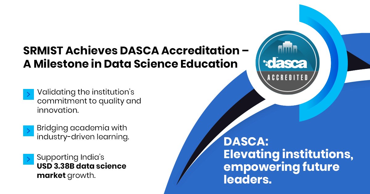 SRM Institute of Science and Technology (SRMIST), receives DASCA accreditation for its Data Science and AI programs, reinforcing its leadership in tech education and academic excellence in the data-driven era. Know more: bit.ly/4cYWyzE #SRMIST #PressRelease #DASCA