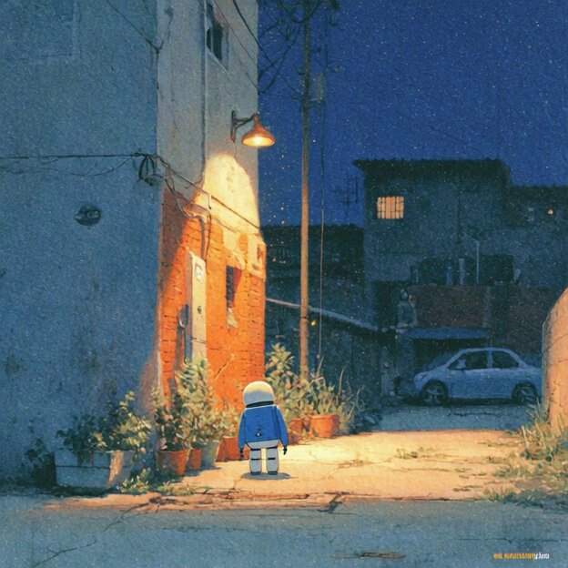 Sad Robots #1 A quiet moment of melancholy, bathed in the soft, textured light of a lonely evening. What do you think a robot is thinking about in this quiet moment? #SadRobots #DigitalArt #sad