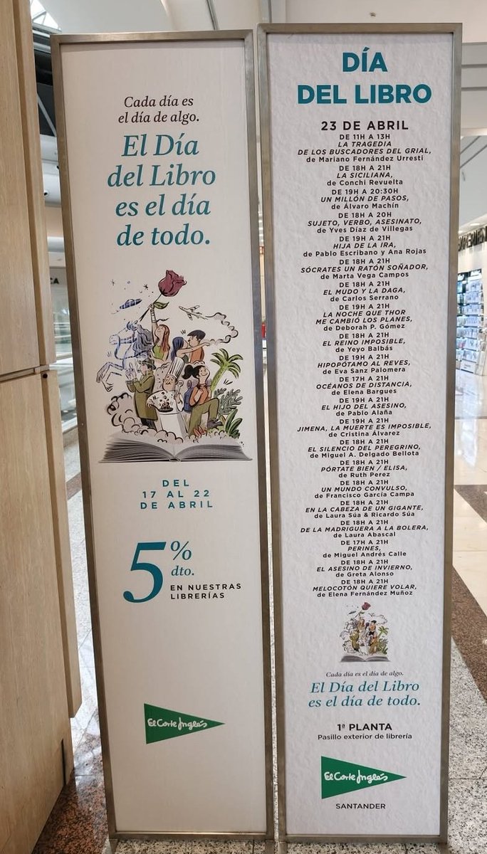 ✈️ DIA DEL LIBRO. Cada día es el día de algo. El Dia del Libro es el día de todo. Así luce en @elcorteingles de #Santander con motivo del #DíaDelLibro Y ahí estará hoy @AlvaroMachinT donde te puede firmar su libro "Un millón de pasos". Un viajero libre. Hoy día 23 👇