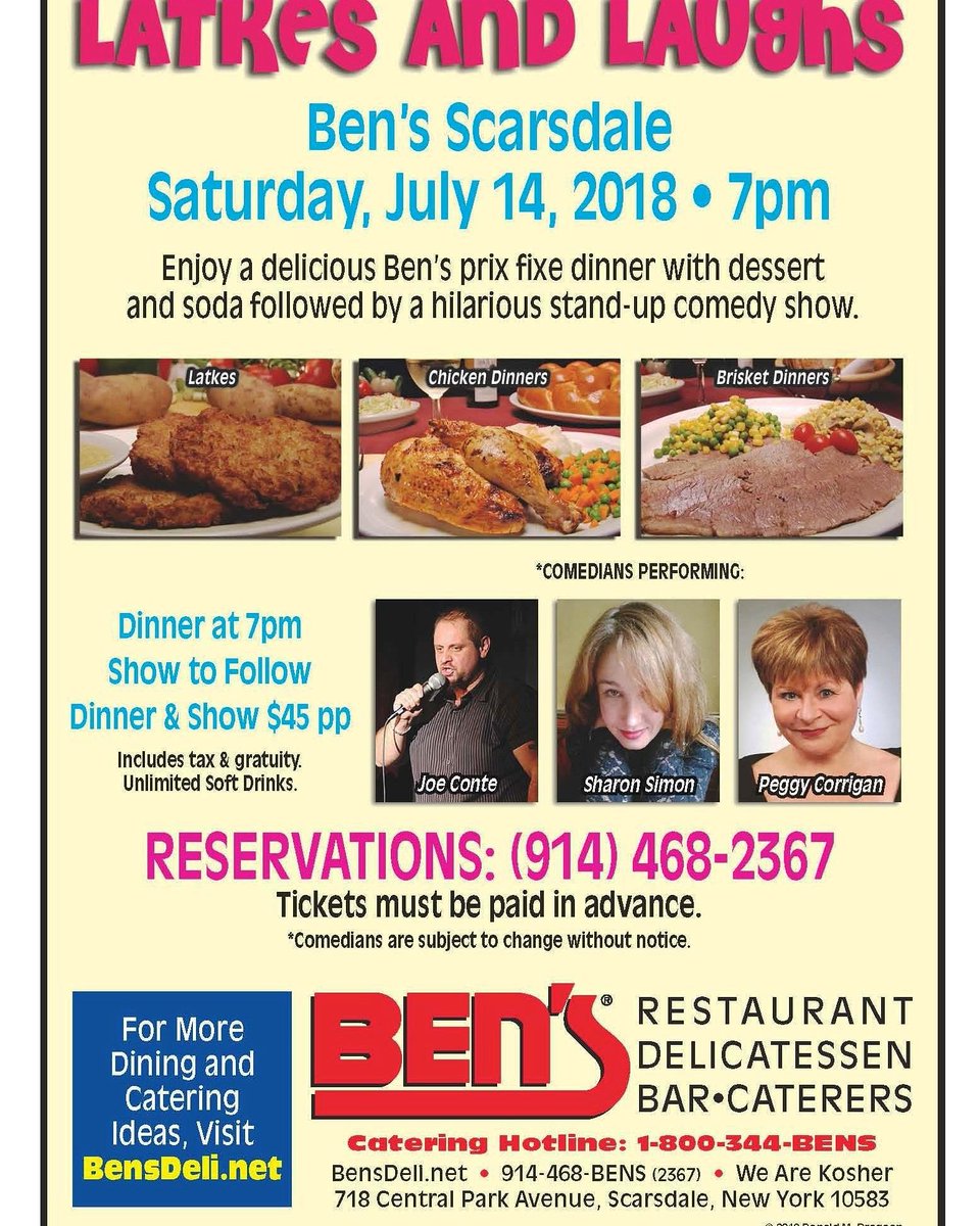 Latkes and Laughs at Ben's Deli returns to Scarsdale Sat July 14 7 pm.$45pp includes all. Reservations (914)468-2367. With Peggy Corrigan Sharon Simon, Joe Conte #Scarsdale #Westchester #SaturdayJuly14 #KosherComedy