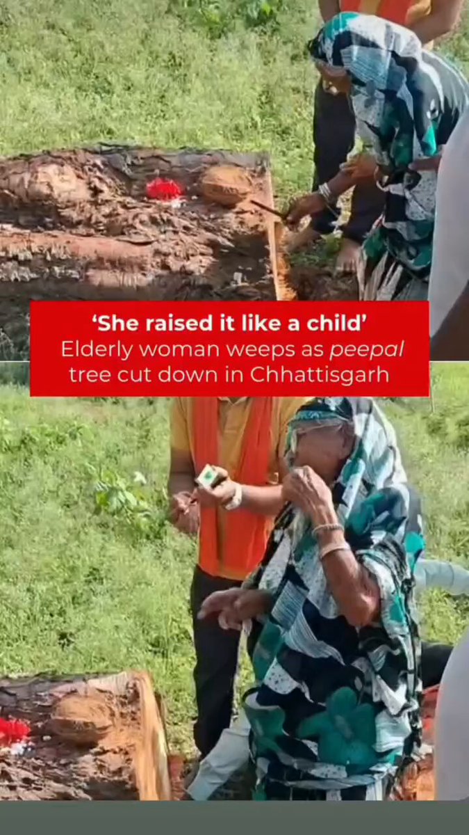 சத்தீஸ்கர் - சர்ரகோண்டி கிராமம்: 20 ஆண்டுகளுக்கு முன்பு ஒரு மூதாட்டி, ஆசையாய் நட்டு வளர்த்த பீப்பல் (Peepal tree) மரத்தை ரியல் எஸ்டேட் முகவர்கள் வெட்டி வீழ்த்தினர் வளர்த்த ஒரு மரத்(குழந்)தை, கண்முன்னே தரையில் விழுந்து கிடப்பதை கண்டு கதறி அழுத்த வயதான தாய். #மரங்கள் #savetrees