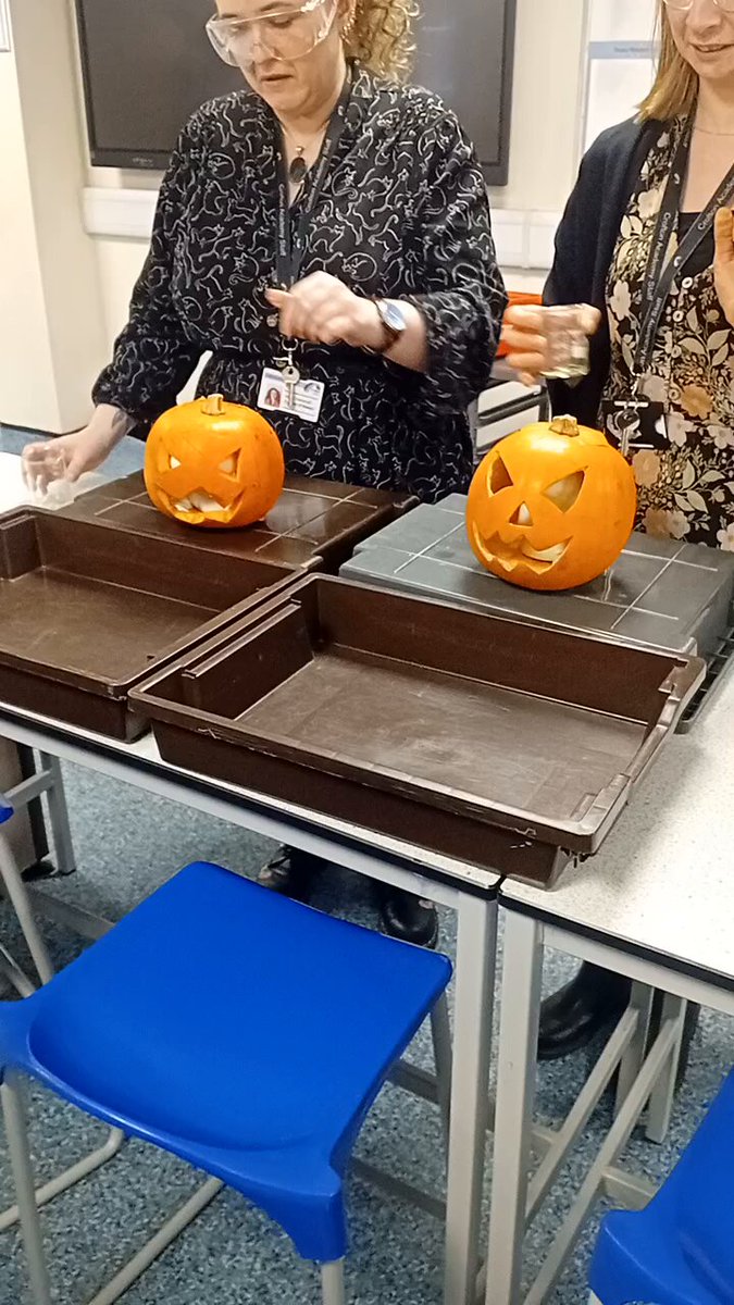 🎃🔬 End-of-term Halloween Science Club fun! A beaker inside a pumpkin with yeast & hydrogen peroxide, the yeast acts as a catalyst, rapidly breaking down H₂O₂ into water & oxygen! A great after school science club activity. Learning & fun! #ScienceIsFun #WeAreCrofton