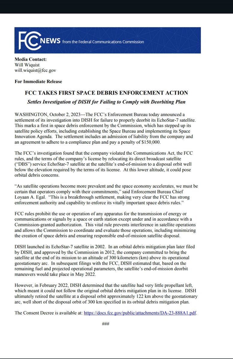 🚨JUST-IN: The first ever fine for space junk the Federal Communications Commission fined Dish Network $150,000 for failing to move an old satellite far enough away from others in use. #SecureSpace