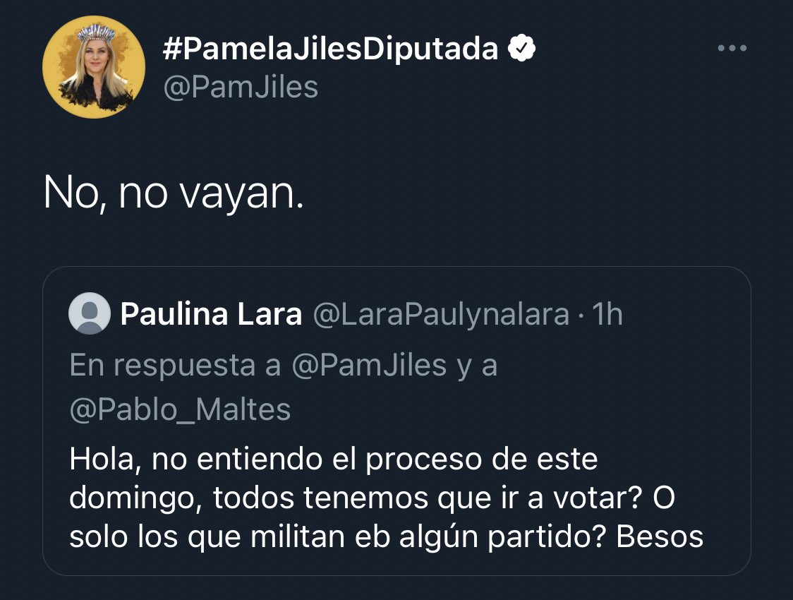 Si no has estado en una población, si no has estado en ollas comunes, si no te has sentado a escuchar sentada en una cuneta, no sabes que a la gente no le importa quien preside la mesa en las cámaras, quieren comer, esa es la prioridad @PamJiles #SegundoRetiroAFP 💪💪