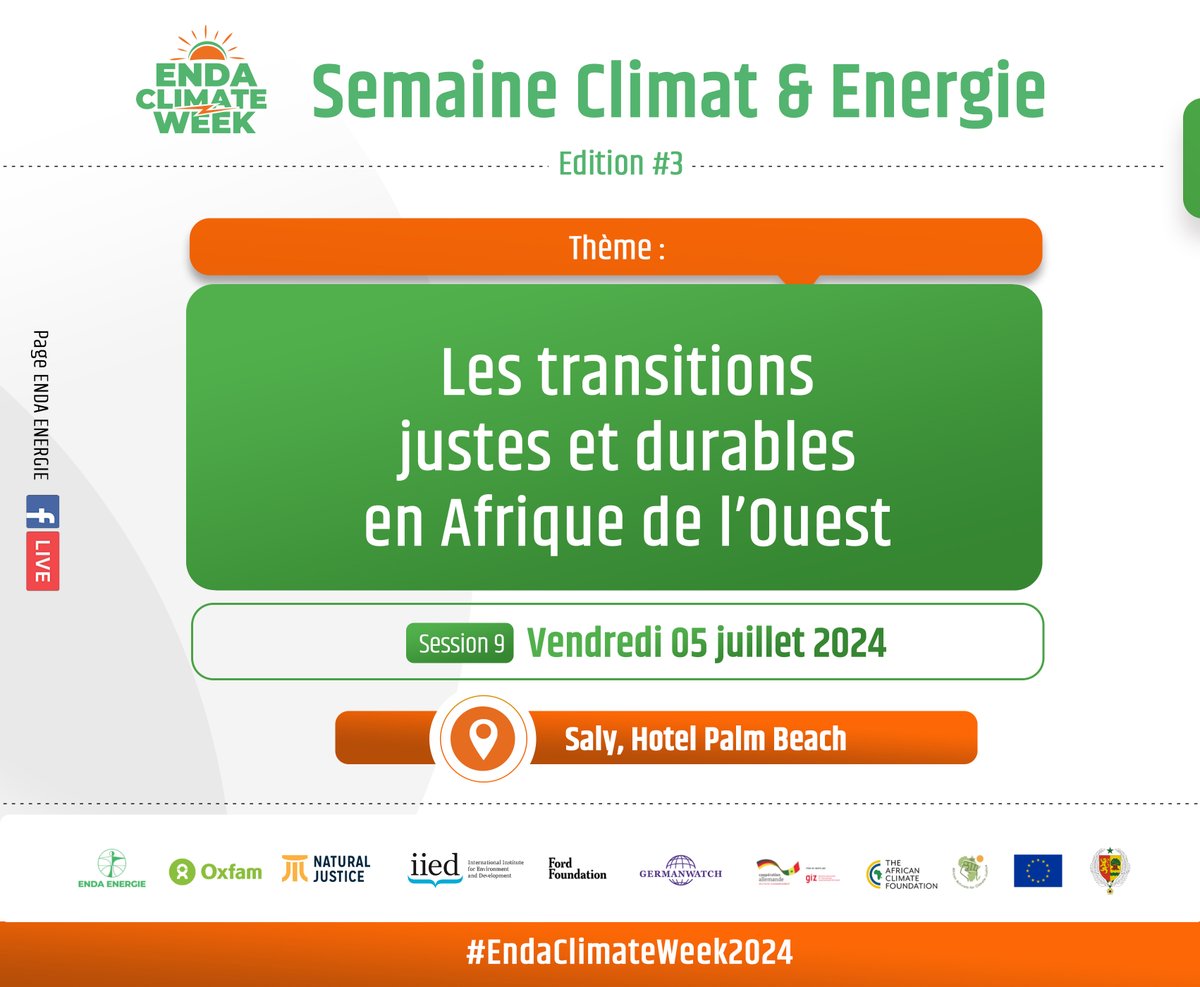 Rejoignez-nous en direct pour la #Session9 sur les transitions justes et durables en Afrique de l'Ouest au #EndaClimateWeek2024 Au programme : Défis et opportunités de la transition énergétique Implication des acteurs non-étatiques Leçons à partager entre pays d'Afrique de