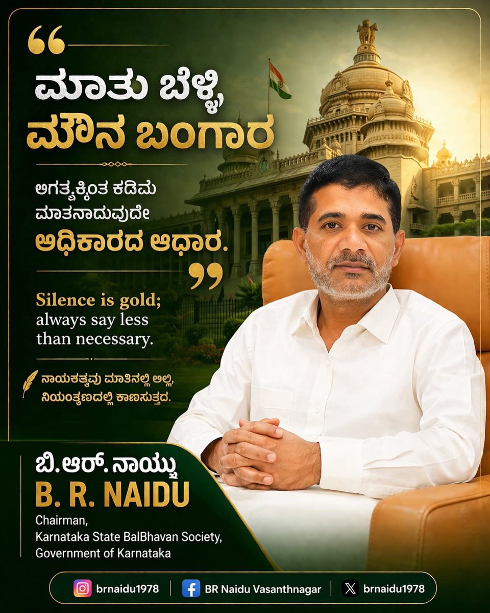 ಮಾತು ಬೆಳ್ಳಿ, ಮೌನ ಬಂಗಾರ; ಅಗತ್ಯಕ್ಕಿಂತ ಕಡಿಮೆ ಮಾತನಾಡುವುದೇ ಅಧಿಕಾರದ ಆಧಾರ. 🤫✨ Silence is gold; say less to hold power. #LawsOfPower #SilenceIsPower #Leadership #Wisdom #BRNaidu @INCIndia @INCKarnataka