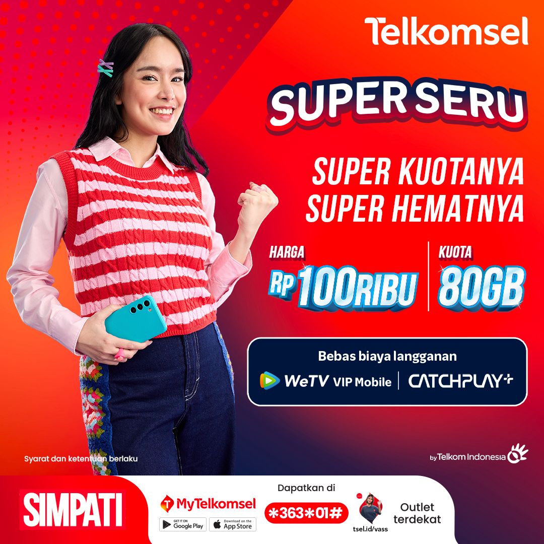 SUPER SERU dari SIMPATI! Super kuotanya, super hematnya!😎 Cuma Rp100.000, kamu langsung dapetin: 🔹 Kuota 80GB 🔹 Sudah termasuk bebas berlangganan WeTV VIP Mobile & CATCHPLAY+ 🎬 *S&K Berlaku #SuperSeruTelkomsel #SIMPATI