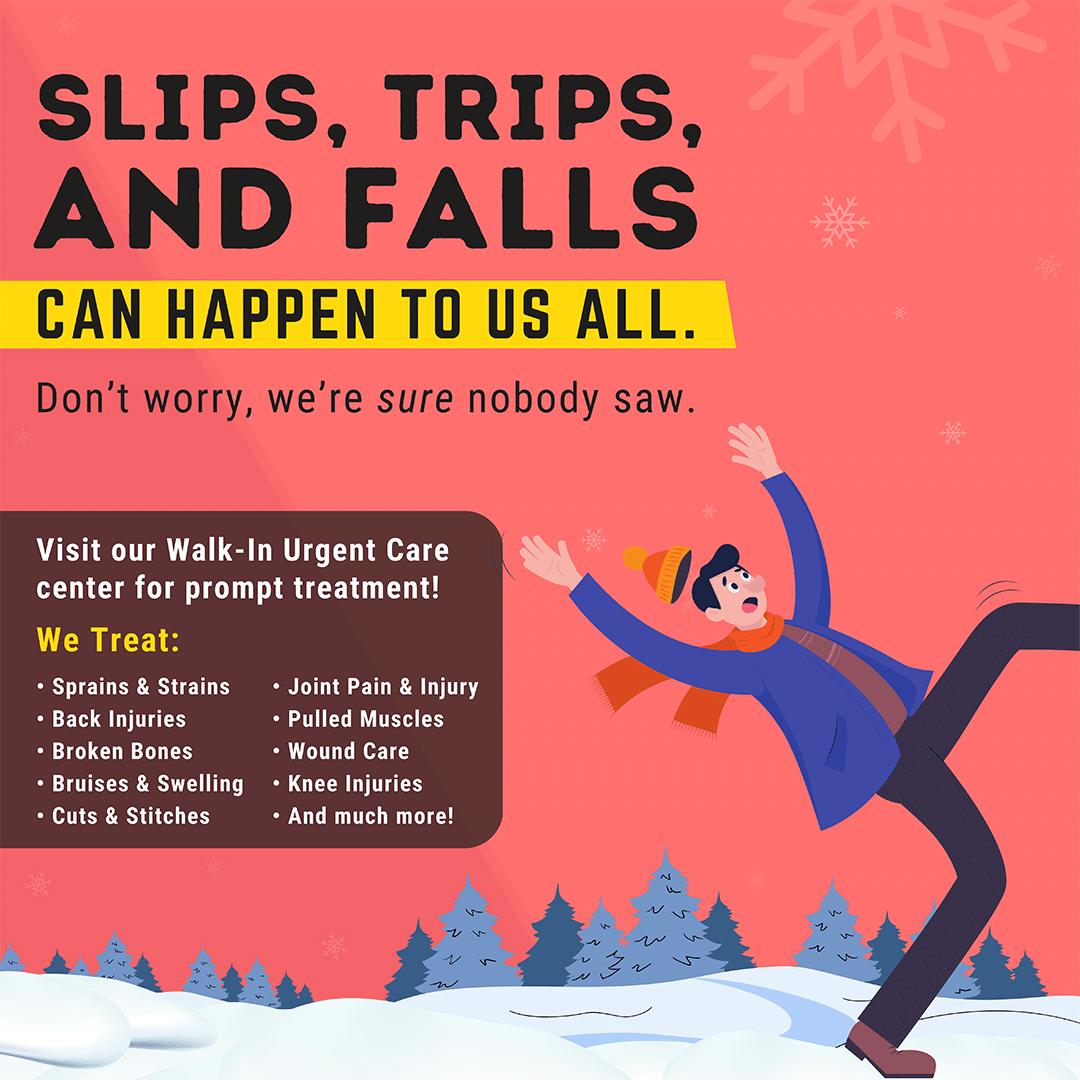 Your well-being is our priority! Walk into our Urgent Care Center confidently, knowing you'll receive attentive care for the most common injuries, illnesses, and ailments! All patients ages 4 months and older are welcome - no appointment is necessary! #SlipperyIce #Injuries