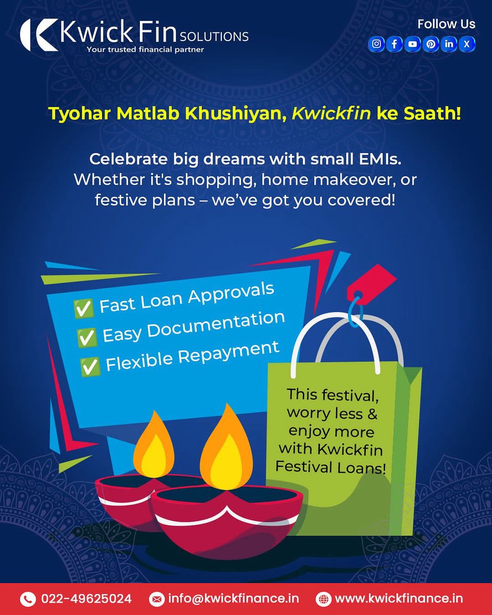 Tyohar ka mazaa, Kwickfin ke saath! 🎉 Big dreams, small EMIs — shop, renovate & celebrate worry-free with Kwickfin Festival Loans. 📞 022-49625024 | ✉️ [email protected] | 🌐 kwickfinance.in #FestivalLoans #Kwickfin #SmallEMIs #CelebrateBig