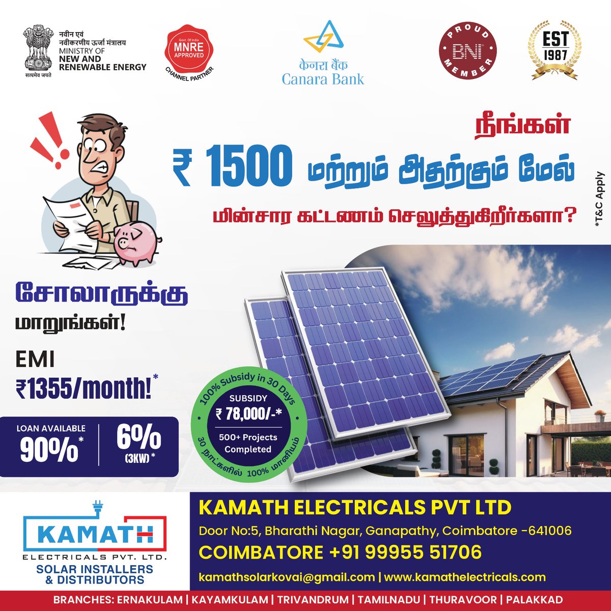 Switch to solar power with Kamath Electricals – Coimbatore ✅ ₹78,000* Subsidy (PM Surya Ghar Yojana) ✅ MNRE/SBI Approved ✅ 90% Loan + EMI ✅ 10-Year Warranty 📞 +91 99955 51706 🌐 kamathelectricals.com #SolarPanelGovtScheme #SolarPanelSetupForHome #SolarRooftopSubsidy