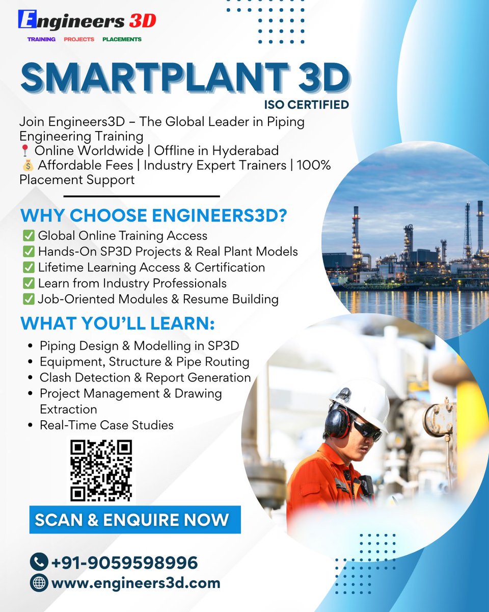 For enquiry click the link - forms.gle/qD3Qj81QbnTbKpโฆ Master Piping Engineering with SMARTPLANT 3D (SP3D)! ๐ Design smart, earn big, grow global! ๐ก #Engineers3D #SP3D #PipingEngineering #SmartPlant3D #DesignEngineer #EngineeringTraining #MechanicalDesign #ProcessPlantDesign