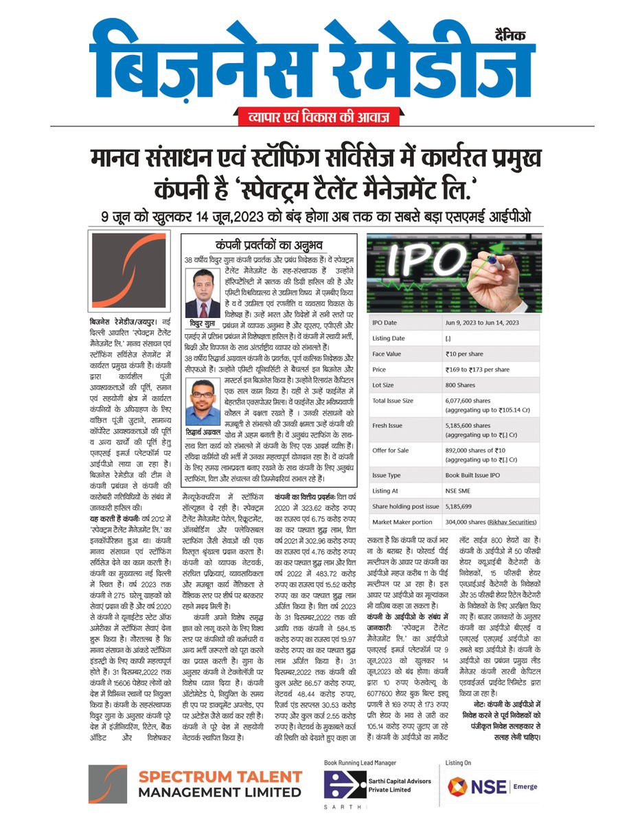 #IPOAlert Spectrum Talent Management Limited is launching its IPO on the NSE Emerge Platform with a price range of Rs. 169 to Rs. 173/- per equity share. The IPO opens on June 9 and closes on June 14. bit.ly/3P2gnMD #NewIPO #SpectrumIPO #NSEEmerge #IPOlaunch #SMEIPO