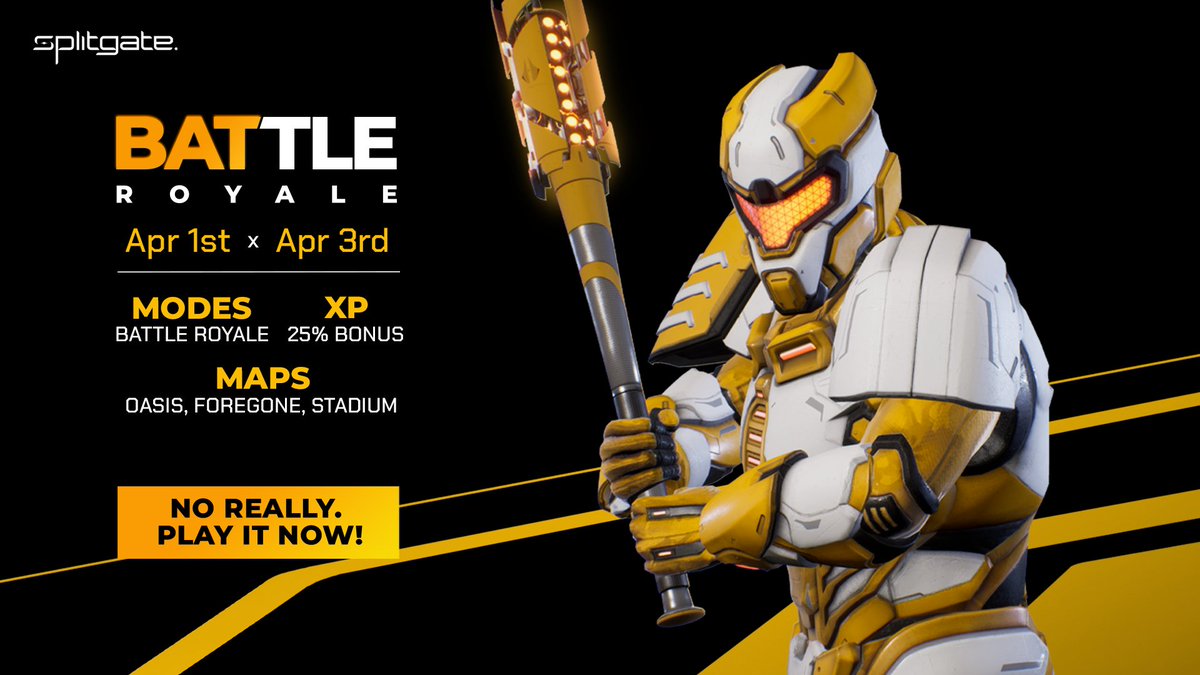 Announcing BATTLE ROYALE finally arriving to Splitgate!!!!!!!!! ...yes you read that right. Play the new mode NOW through Sunday! 💥 #SplitgateBATtleRoyale
