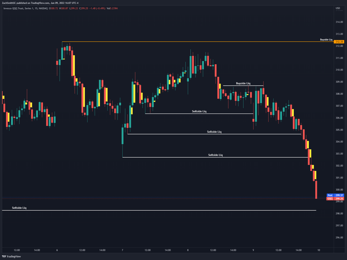 $QQQ Hunted sellside liquidity at open, shifted to hunting buyside above, then shifted again to hunt sellside below for remainder of day. What is low can go lower #Spooling