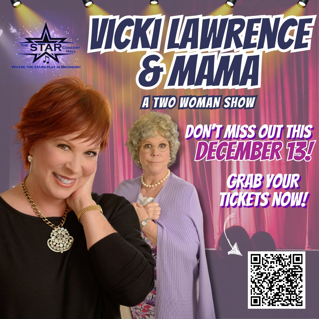 Exciting News! Vicki Lawrence is bringing her iconic Mama character back to the stage in Branson, MO on Dec 13, 2024! Get ready for a hilarious and heartwarming evening of music, comedy, and storytelling! Get your tickets now! bit.ly/4enRQeU #BransonMO #Starhall