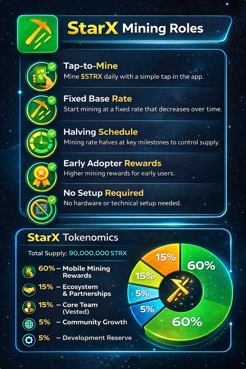 #STARX uses a smart token distribution model users earn STRX through ecosystem activity. includes halving, meaning mining rewards reduce over time — preventing unlimited supply. Less supply + growing adoption = stronger scarcity potential value growth. #starxnetwork #starx #strx