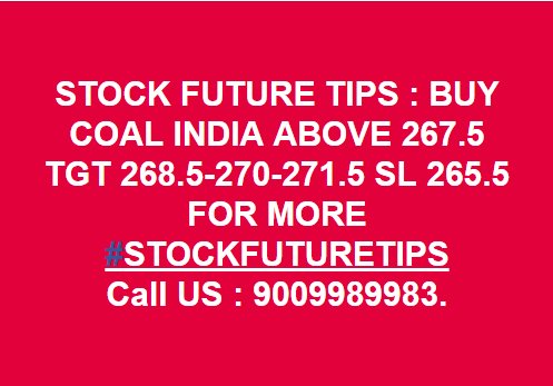 STOCK FUTURE TIPS : BUY COAL INDIA ABOVE 267.5 TGT 268.5-270-271.5 SL 265.5... FOR MORE #STOCKFUTURETIPS Call US : 9009989983 Or Subscribe us : futureinvestments.in #StockTips #FreeTips #CoalIndia #FutureInvestment #MondayMotivation #AirForceDay #StrongerThanTime