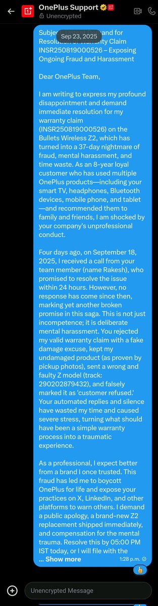 I will also post the DM screenshot showing that nothing was communicated in writing as you claim. Customers deserve transparency, not changing stories. @OnePlus_IN @OnePlus @PeteLau @oneplus @OnePlus_USA #BoycottOnePlus #OnePlusScam #StopOnePlusFraud #OnePlusExposed #FraudCompany