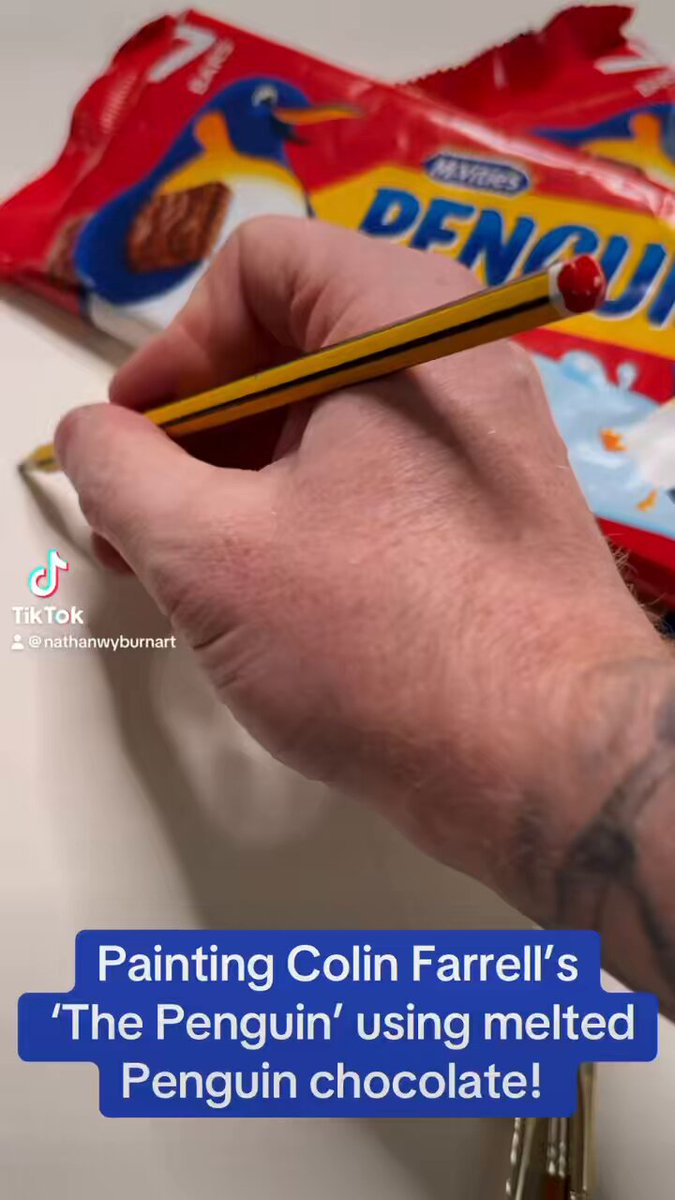 Painting #ColinFarrell as #ThePenguin using MELTED PENGUIN CHOCOLATE!! 🍫 @StreamOnMax @TheBatman #StreamOnMax #hbomax #thebatman #fyp #nathanwyburn #gotham #art #artistsofinstagram #foodart #foodartist #chocolateart #chocolatepainting @McVities