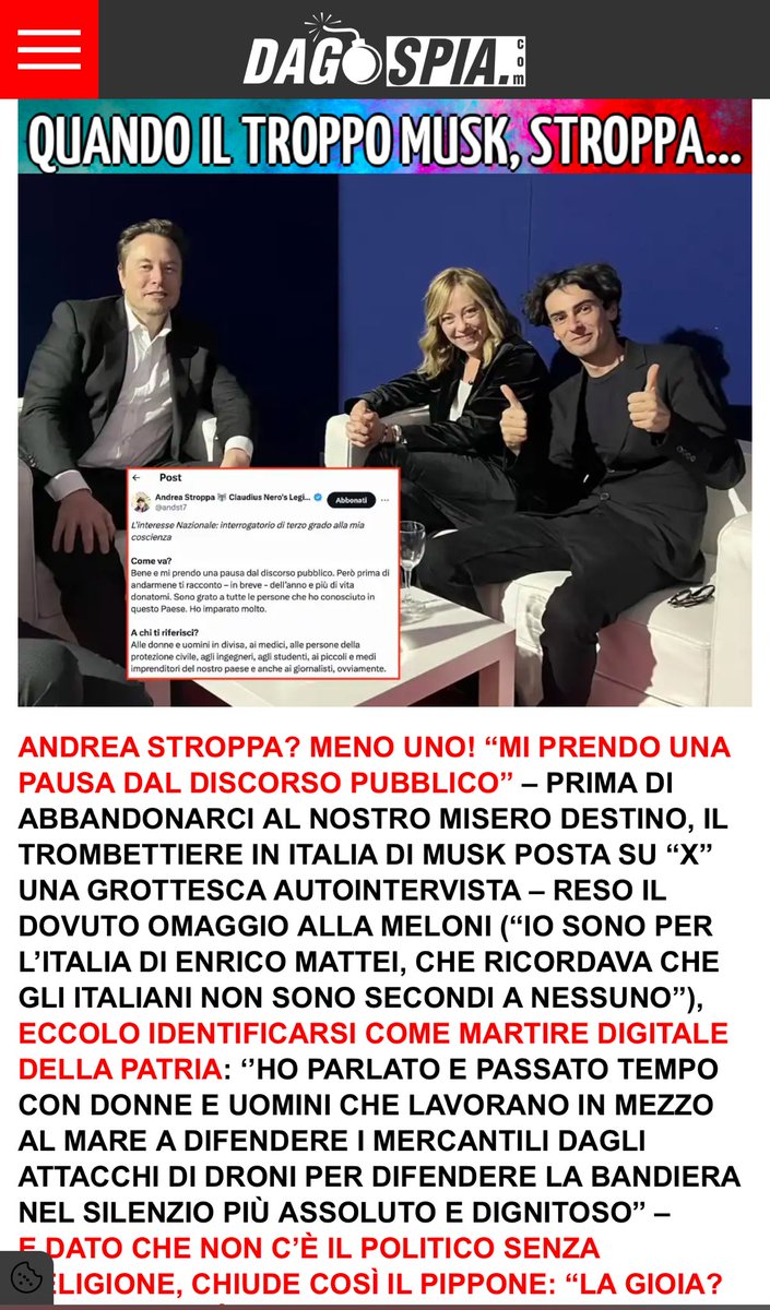 Idillio già finito. Il troppo Stroppa. #Stroppa, l’uomo di Musk, contro FdI: “Vi accordate col Pd? Allora evitate di chiamarci” - la Repubblica repubblica.it/politica/2025/…