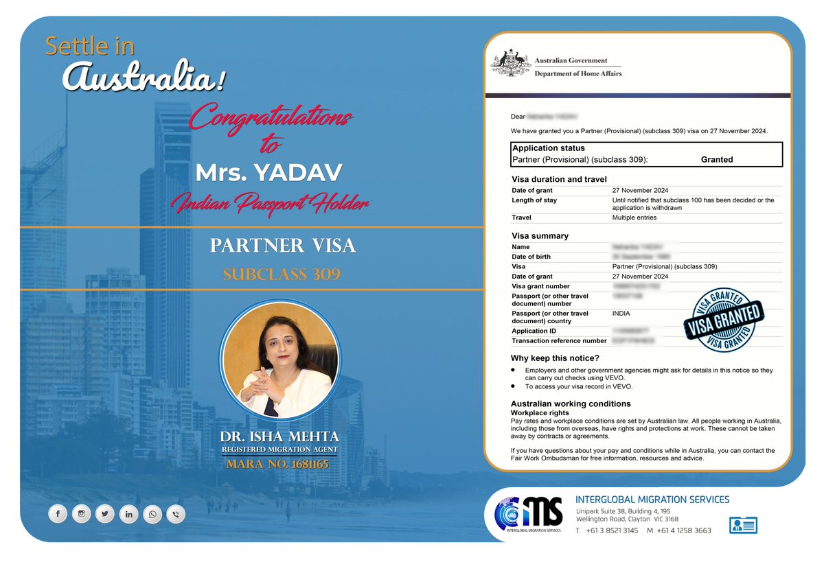 Congratulations Mrs. Yadav! 💍 We are excited to announce that Mrs. Yadav from India has successfully been granted her Partner Visa (Subclass 309)! 🎉 📞 +61 (3) 8521 3145 🌐 imsmigration.com.au 📧 [email protected] #PartnerVisa #VisaGranted #Subclass309