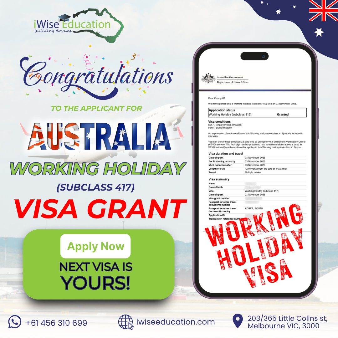 ๐ Congratulations to our applicant for receiving the Australia ๐ฆ๐บ Working Holiday Visa (Subclass 417)! Fill the Form: tinyurl.com/2p8ymk9v #AustraliaVisa #WorkingHolidayVisa #Subclass417 #VisaGrant #iWiseEducation #StudyAbroad #WorkAndTravel #AustraliaDream #VisaApproved