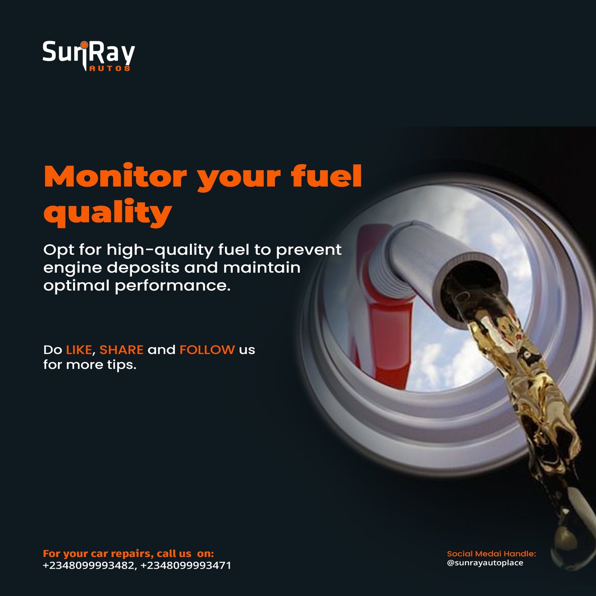 Tips for maintaining engine performance: 3 expert tips to keep your car running smoothly: 🛢️ Stay on top of oil changes: 🌬️ Check your air filter ⛽ Monitor your fuel quality: #MyFuelChoice! #FuelQuality #SunRayAuto