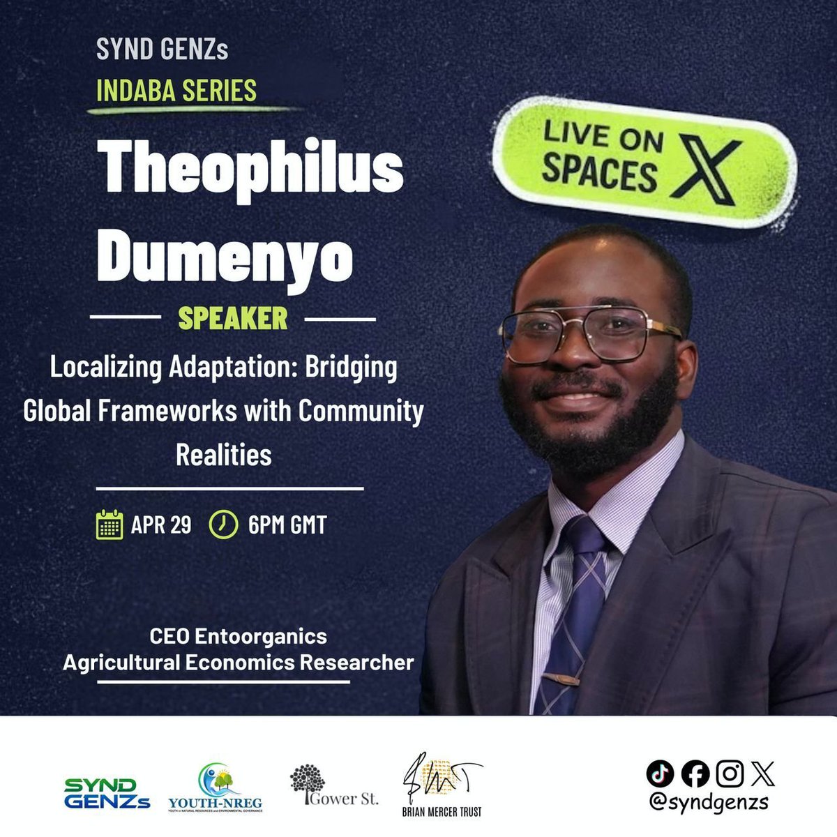 Meet Theophilus Dumenyo, our 2nd speaker Join us on Wednesday, 29th April 2026 at 6:00 PM GMT on X Space as we discuss Localizing Adaptation: Bridging Global Frameworks with Community Realities Set reminder 👇🏾 x.com/i/spaces/1oKMv… #ClimateAction #Sustainability #syndgenzs