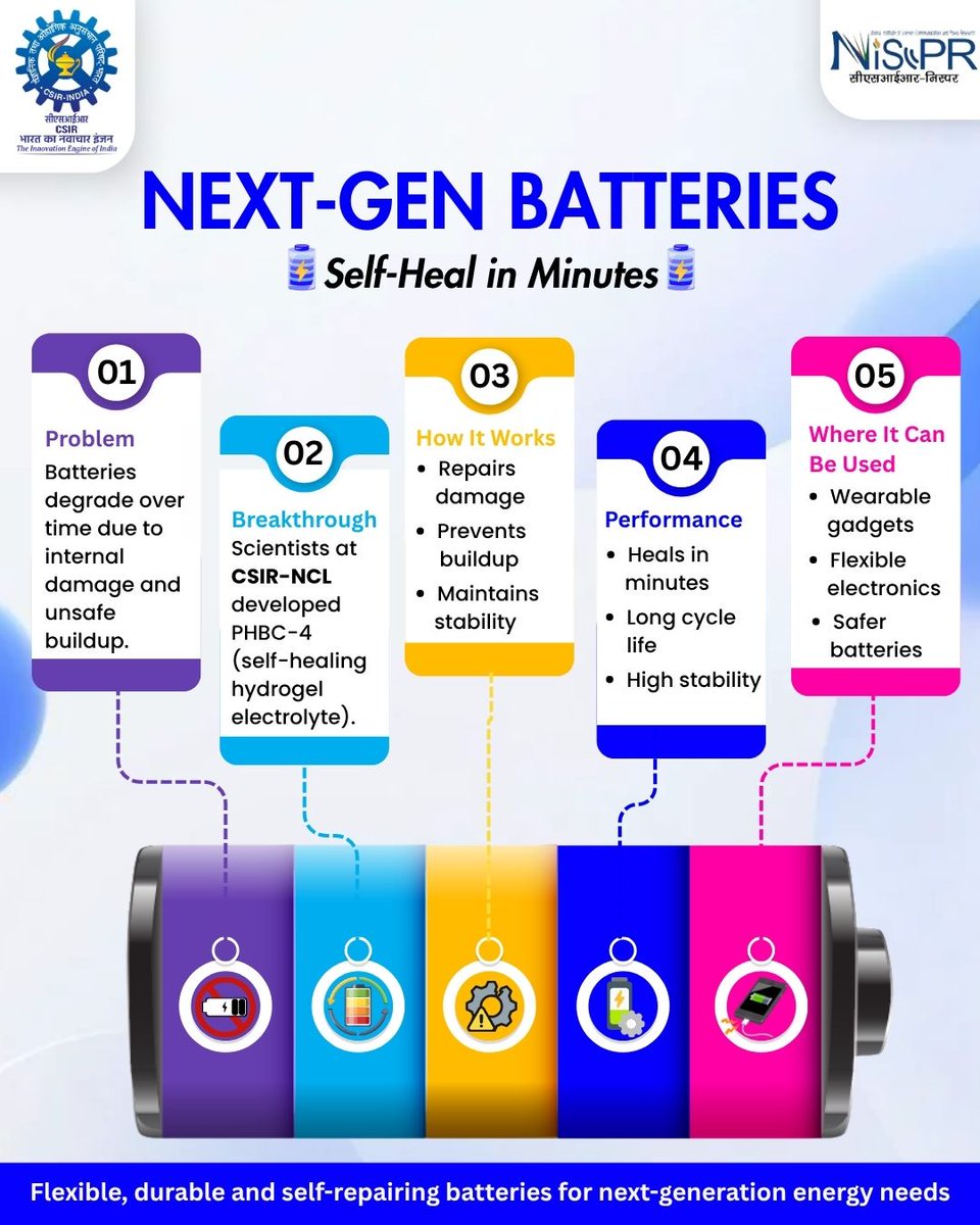 Scientists at CSIR-NCL have developed a self-healing hydrogel electrolyte that repairs damage, improves stability, and extends battery life. @CSIR_IND @AshishLele3467 @DrJitendraSingh #Innovation #NextGenBatteries #SustainableEnergy #ScienceForSociety