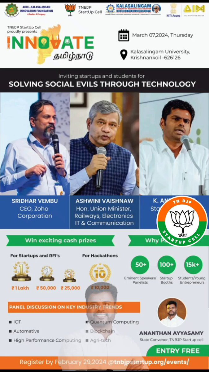 Join us at Innovate தமிழ்நாடு on a March 7, 2024 at Kalasilingam University, Krishnankoil for exciting and informative sessions on multiple emerging technologies. #InnovateTN #TNBJPStartupCell #PanelDiscussions @TenkasiAnanthan