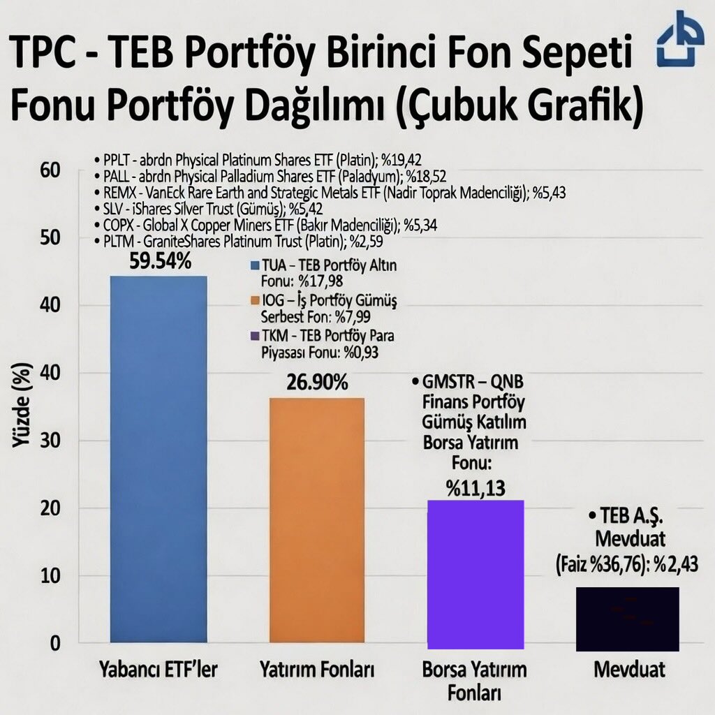 #TPC - TEB Portföy Birinci Fon Sepeti Fonu Portföy Dağılımı; Fonun portföy dağılımı (sağlanan verilere göre, Şubat 2026 dönemi) ağırlıklı olarak yabancı fiziksel kıymetli maden ve emtia ETF’lerine odaklanıyor. Ana Kategoriler: • Yabancı ETF’ler: %59,54 • Yatırım Fonları: