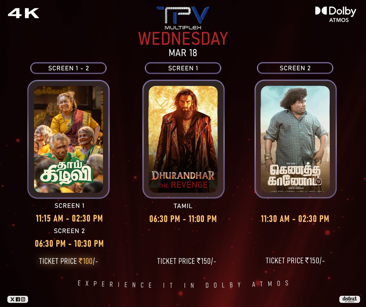🔥 March 18 = Full theatre festival 🎬 Dhurandhar: The Revenge, Thaikilavi, Kenaatha Kaanom 📍 TPV Multiplex la back-to-back mass 💥 Miss pannina regret guarantee #TPVMultiplex #MassLineup #TheatreVibes