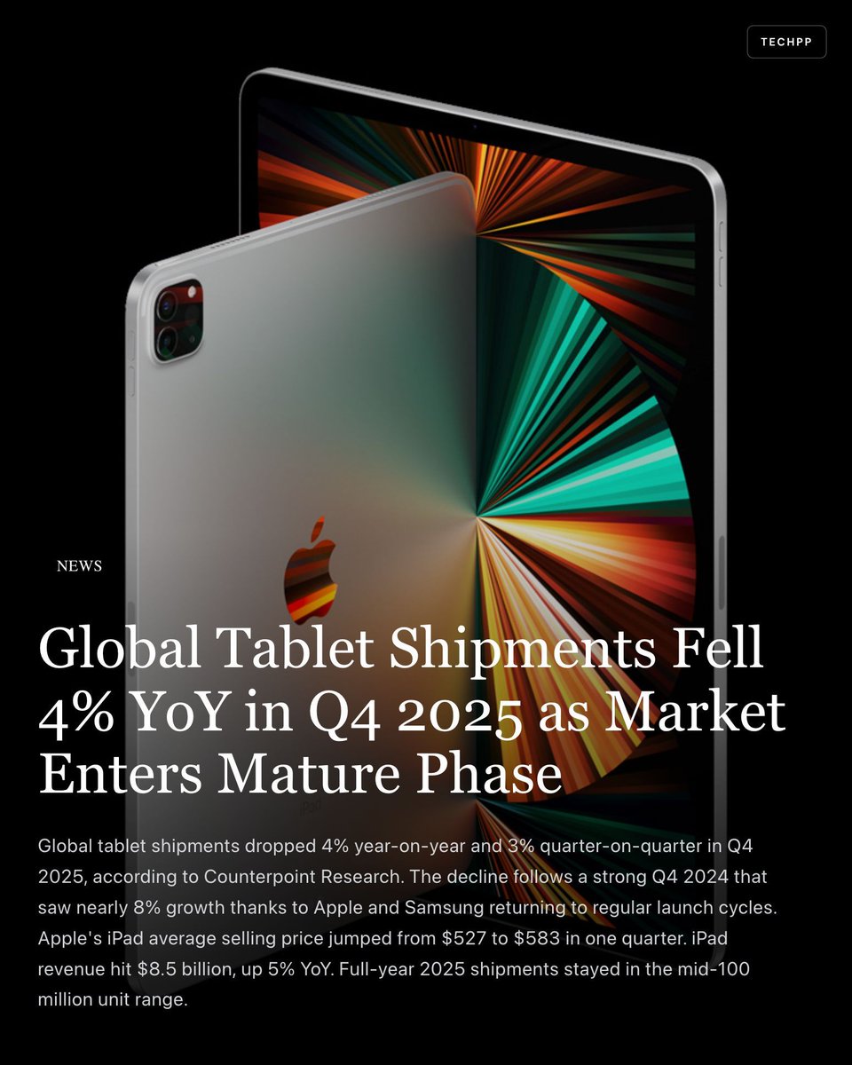 Global Tablet Shipments Fell 4% YoY in Q4 2025 as Market Enters Mature Phase #Tablets #Apple #iPad #Counterpoint #MarketData