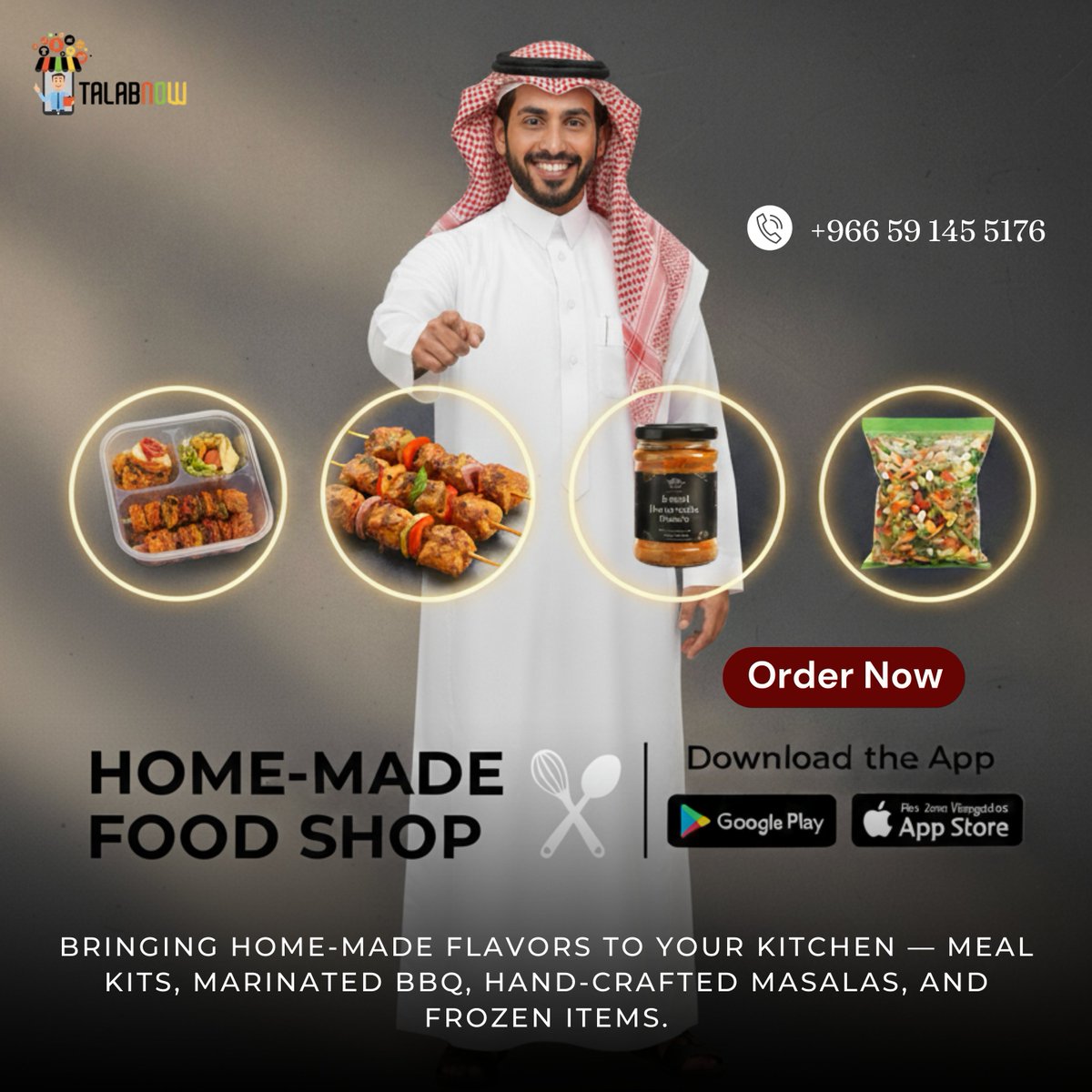 🍲✨ Taste the Love of Home! Authentic homemade meals, BBQ marinades & masalas — fresh, fast & full of flavor via #TalabNow 💚 Contact us: +966 591455176 📲 Download now: 👉 Android | iOS