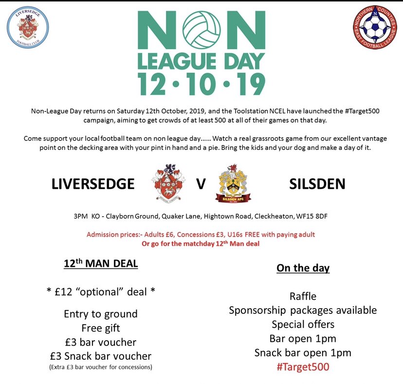 @Liversedge_FC @SilsdenAFC NEXT SATURDAY 12th OCTOBER Come support grassroots football on Non League day. Teach the youngsters that football isn't just a match on TV. It’s a day out with family, our football family. #NCEL #Target500 #nonleagueday @nonleaguedayuk