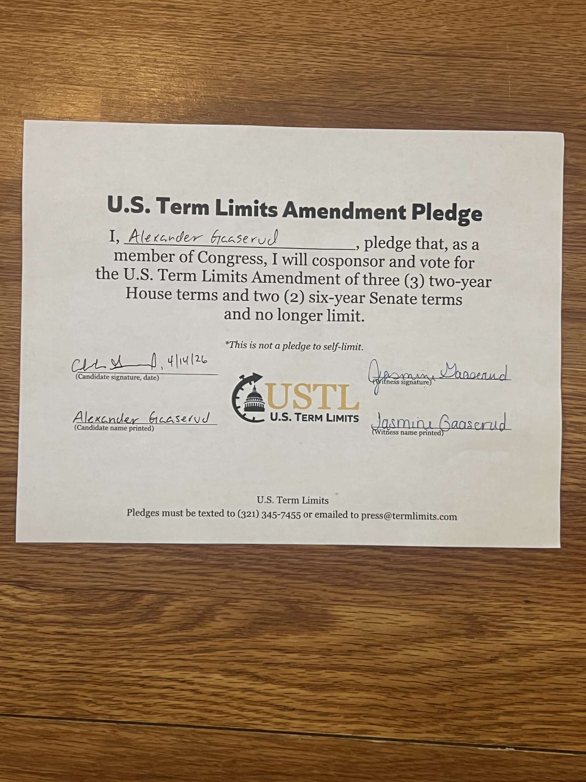 Thank you @AlexGaaserud4WV for signing the #termlimits on Congress pledge. It’s a significant step toward meaningful legislative reform. termlimits.com/wp-content/upl…