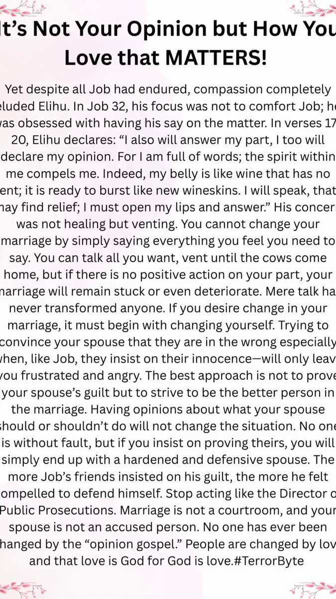 Stop acting like the Director of Public Prosecutions. Marriage is not a courtroom, and your spouse is not an accused person. No one has ever been changed by the “opinion gospel.” People are changed by love and that love is God for God is love.#TerrorByte