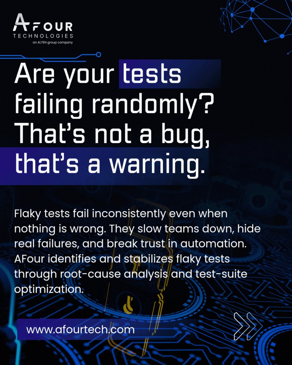 Flaky tests don’t just waste time; they erode confidence in your automation. AFour’s root-cause analysis and optimisation bring back clarity, consistency, and trust in every release. #AFourTechnologies #DevOpsCulture #TestStability #EngineeringTeams #CICDOptimization