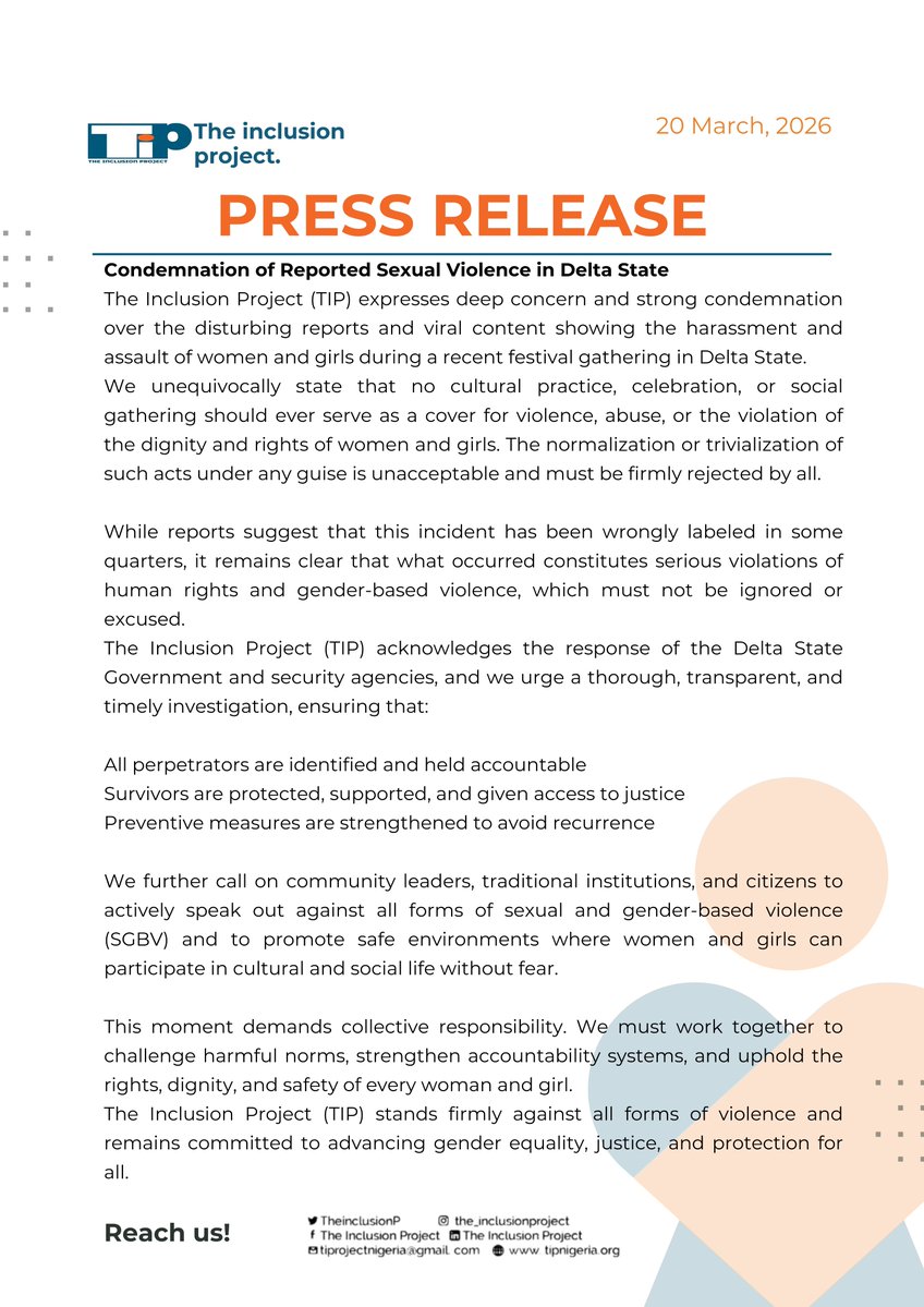 Together, we must stand against all forms of sexual and gender-based violence and create safer spaces for women and girls. #TheInclusionProject #EndSGBV #ProtectWomenAndGirls #GenderEquality #SpeakOut #StopViolence #DeltaState #HumanRights