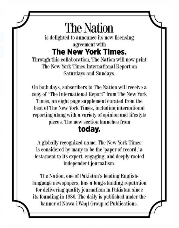 We are happy to announce that now our organization's English newspaper @The_Nation now collaborate with #TheNewYorkTimes .You can read the international Reports on Saturday and sundays at The New York Time The New York Times #TheNation #NWG @Nawaiwaqt_ @nytimes