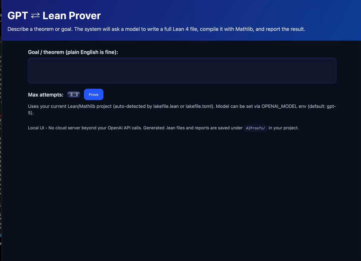 I vibe-coded a bridge from natural language to formal proof: type “Prove that √2 is irrational”, GPT-5 emits a Lean script, and Lean checks it. Next version: a chat stage so GPT and I refine the claim before compiling. Video demo below. #Lean #TheoremProving #GPT5