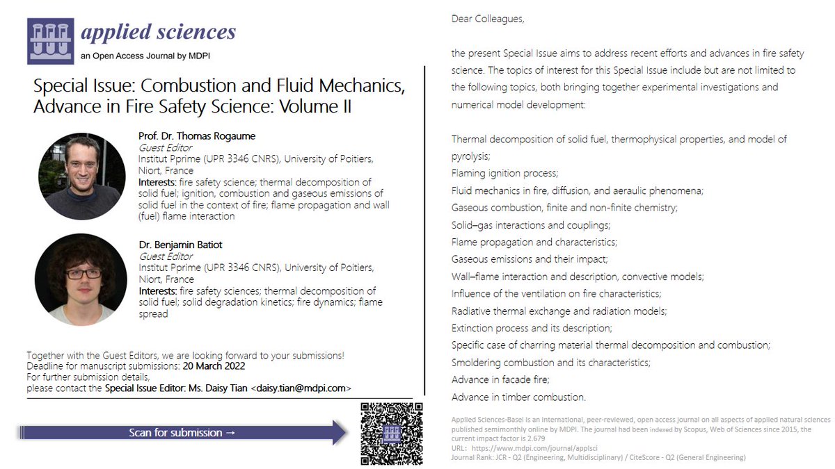 #SpecialIssue mdpi.com/journal/applsc… DD: 20 March 2022 GEs: Prof. Dr. Thomas Rogaume and Dr. Benjamin Batiot from @UnivPoitiers #thermaldecomposition #ignitionprocess #gaseouscombustion #flamepropagation #radiation #smolderingcombustion #facadecombustion #timbercombustion