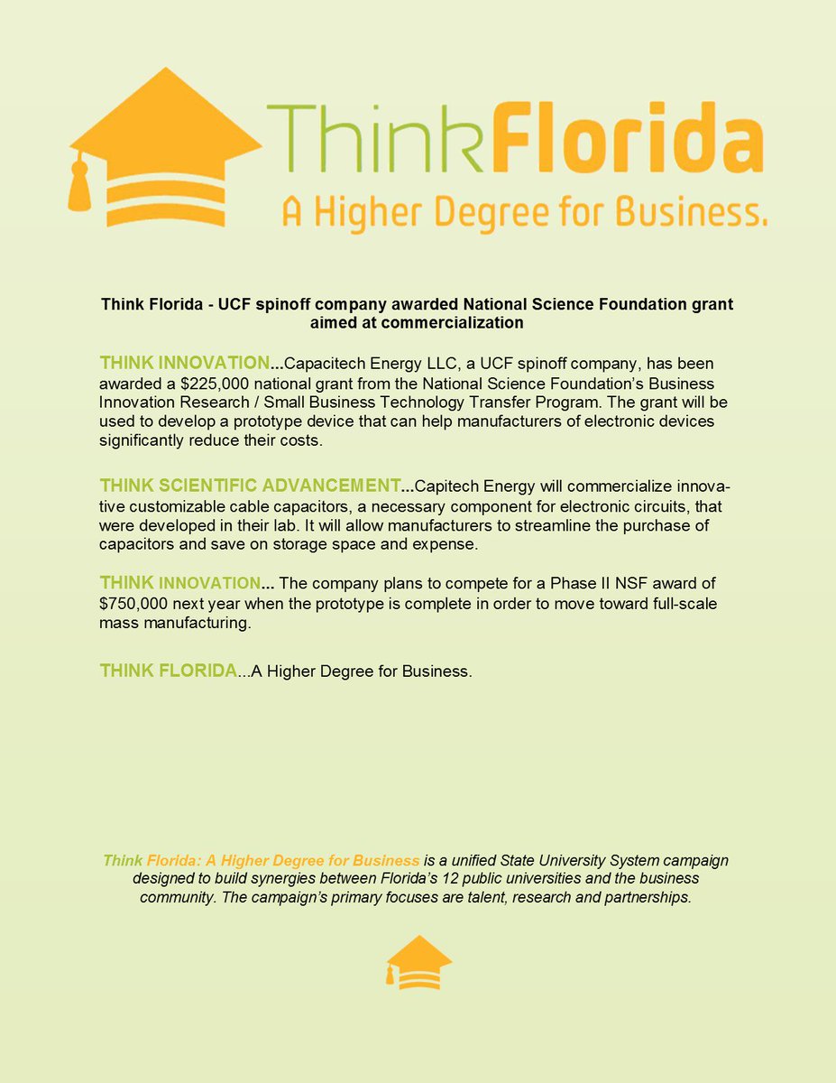 RT @FLBOG: #ThinkFlorida @UCF spinoff company awarded National Science Foundation grant aimed at commercialization. Get more #ThinkFlorida information on our website: think-florida.org