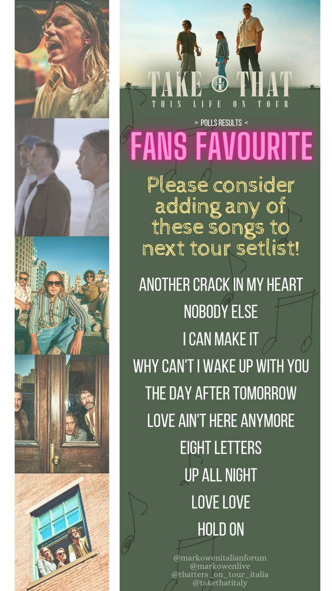 It would be amazing if you could pick a few to add to your tour setlist next year! @takethat @OfficialMarkO @GaryBarlow #thislifetour