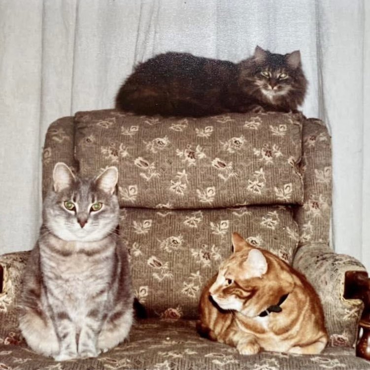 Cat interlude between dog years -- #throwbackthursday to 44 years ago, when I shared a Vermont apartment with Emily (gray), and two from her first litter: Ingmar (gold) and Mimosa (up top). I'm glad they let me stick around and feed them. #cats
