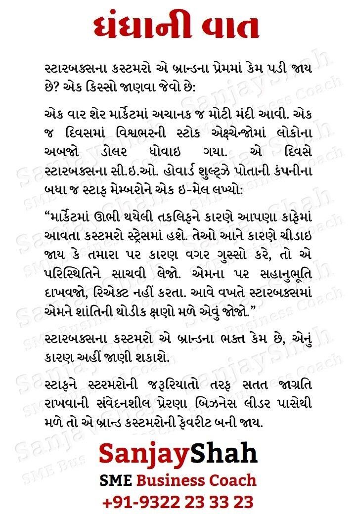 અમે વિકાસશીલ SME ધંધાઓને નેક્ષ્ટ લેવલ પર લઇ જવા માટે કસ્ટમાઇઝ્ડ બિઝનેસ કોચિંગ પૂરું પાડીએ છીએ. અમારા કામ સંબંધિત બંધી લિન્ક્સ માટે અહીં ક્લિક કરો… linktr.ee/sanjayshah912 #business #tips #quotes #success #gujarati #ગુજરાત #બિઝનેસ #ધંધો #મોટિવેશન #coaching #SME