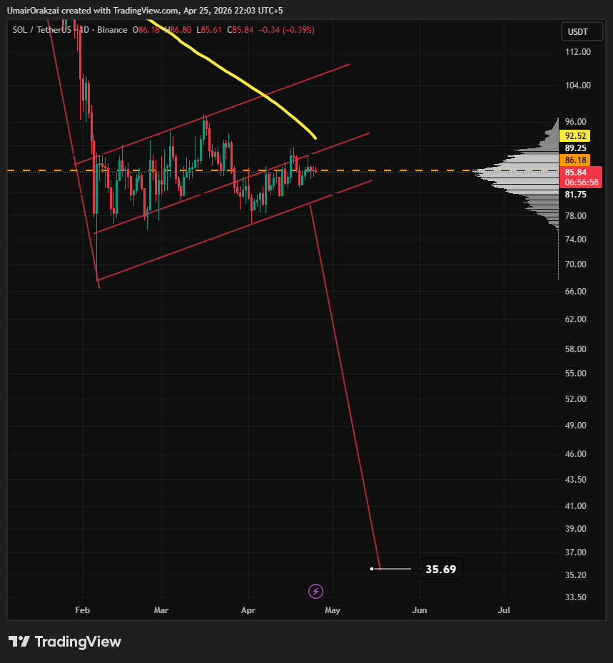 $SOL Topped around 260, and now trading 67% below all time high, Solana has seen a lot of ups, but not a lot of downs. The pattern tells us it is going around $35, would you buy it there? Or, can it actually go there? #CRYPTO #TRADING #BTC #SOL #MARKETUPDATE