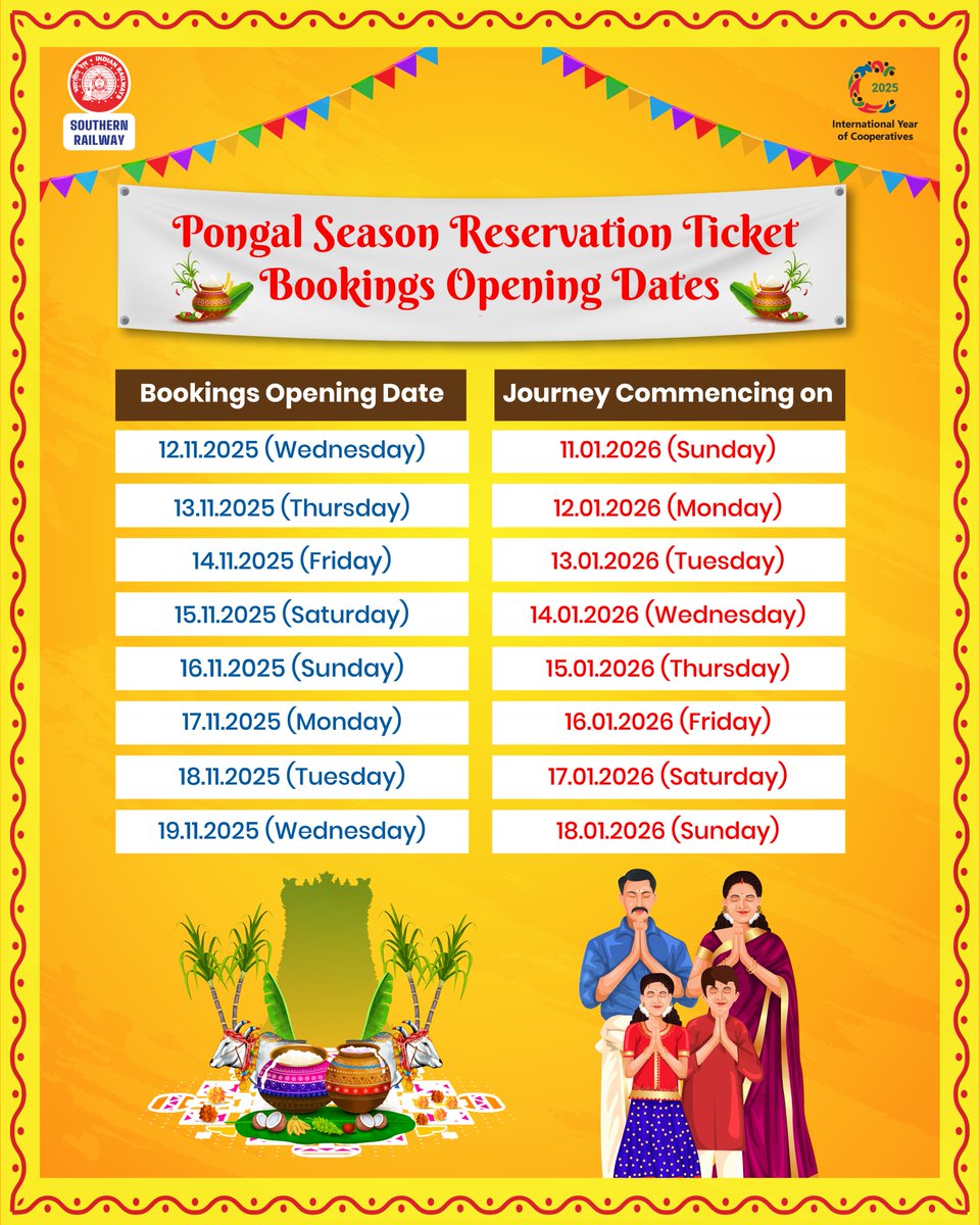Book Your Pongal 2026 Journey!🚂 Southern Railway's reservation opening dates are here. Bookings start 60 days in advance, beginning November 12, 2025. Check the schedule to secure your tickets! #Pongal2026 #SouthernRailway #TrainTickets #IndianRailways