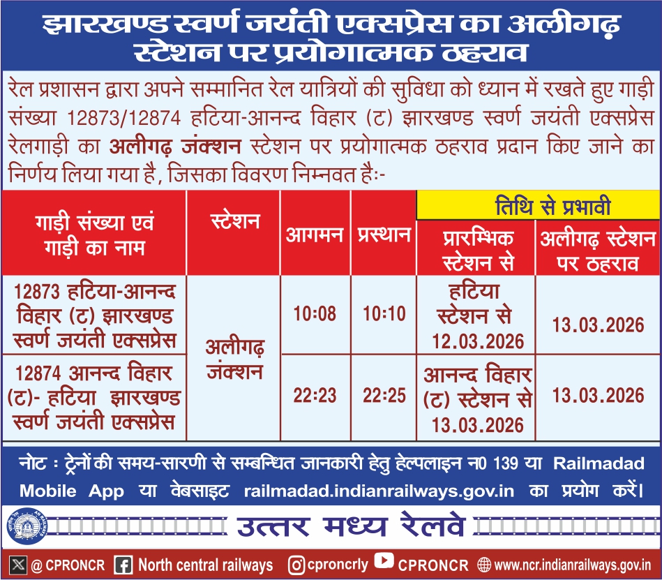 सर्व साधारण को सूचित किया जाता है कि उत्तर मध्य रेलवे की नई समय सारणी दिनांक 01.01.2025 से प्रभावी हो गयी है। नई समय सारणी 2025 की कुछ महत्वपूर्ण विशेषताएं/विवरण निम्नानुसार है:- #NCRailway #IndianRailways #TrainTimeTable