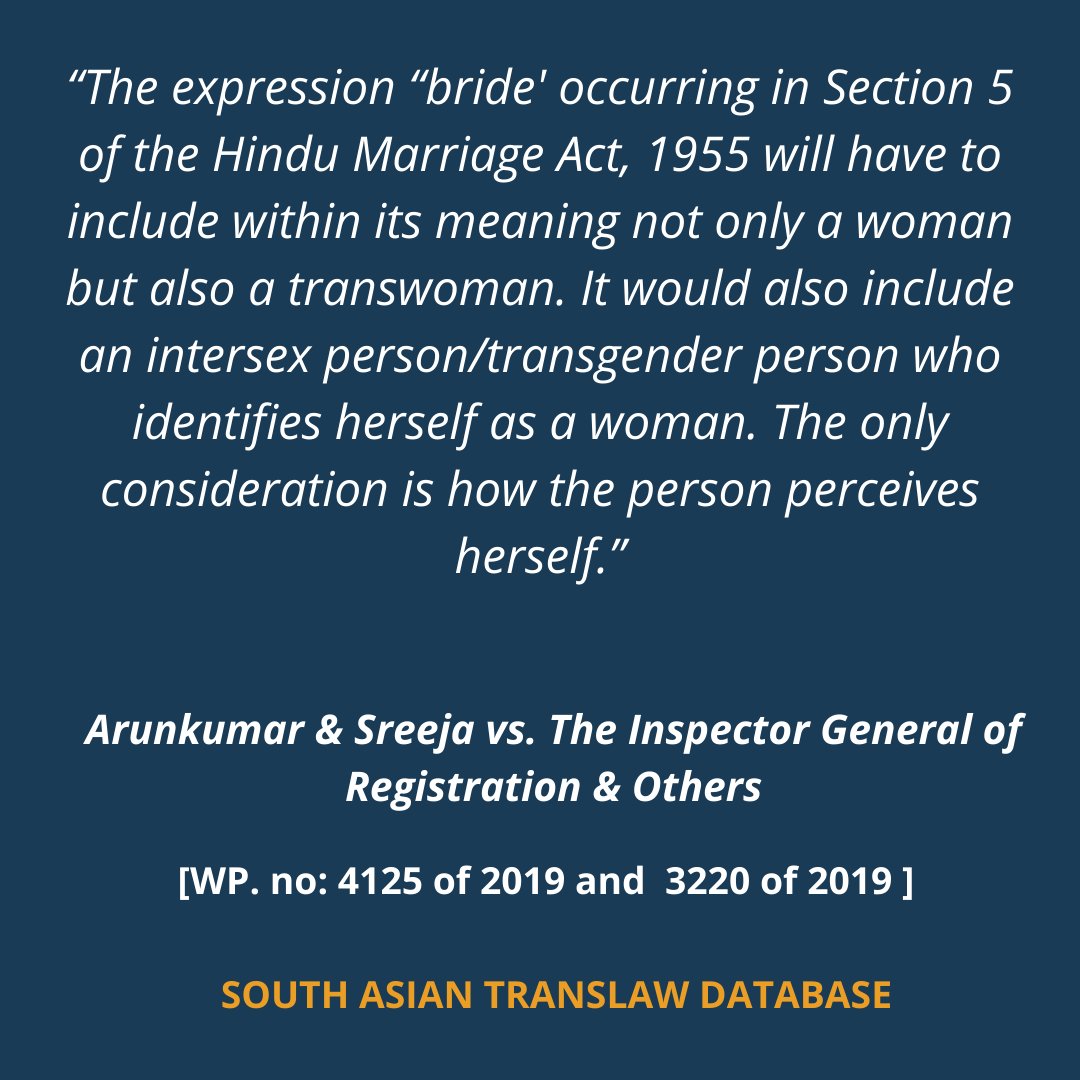Today in the #KnowYourRights series we talk about #RightToMarriage for trans persons. The case: Arunkumar & Sreeja v. The Inspector General of Registration & Others(22nd April 2019) #TransLawDatabase #SATD #southasiantranslawdatabase #TransWomenareWomen @GiveOut_Org @CLPRtrust